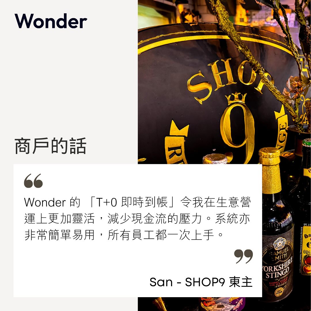 "In the current economic environment, running a small restaurant and lounge like Shop9 Restaurant & Lounge is indeed full of challenges. As the owner, I deeply understand the importance of cash flow, especially during these uncertain times. Many of my peers tend to accept only cash to avoid credit card payments that delay funds for 5 to 7 days. But the reality is, customers are increasingly preferring to pay with credit cards, and we cannot refuse them. That's when I discovered Wonder's T+0 instant settlement service, which was nothing short of revolutionary for us. Whenever customers pay with a credit card, the funds are immediately available, just like receiving cash, greatly improving our cash flow. In a competitive area like Sai Wan, the ability to quickly rotate funds is crucial for maintaining business operations. Additionally, Wonder's ultra-low transaction fee was also a pleasant surprise. In today's environment of tightening expenses and improving efficiency, every bit of cost saving is very critical. This not only helped us save on fees but also improved our profitability." - Owner of Shop9 Restaurant & Lounge, Ah San.