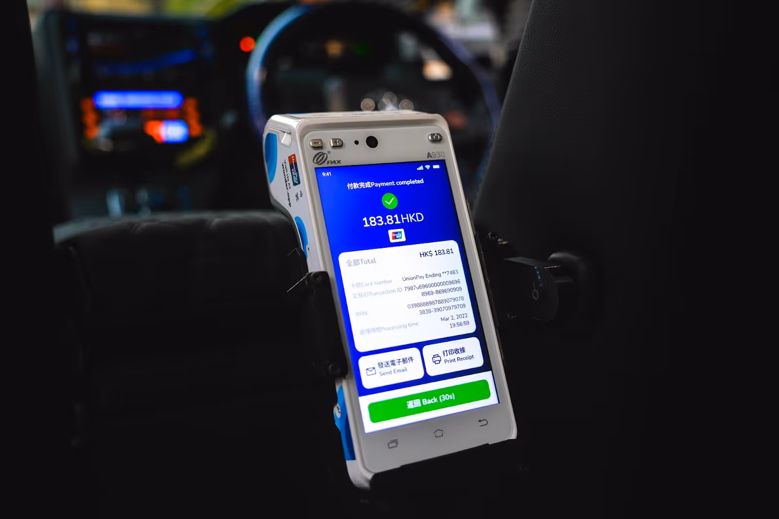 Our digital payments platform revolutionises the taxi industry by directly integrating over 18 different local and international payment options with the smart taxi meter. As such, taxi passengers can conveniently choose to pay by scanning a QR code to pay on their mobile phone or by tapping their cards on the payment terminal, whereby the taxi fares are directly linked to the smart taximeter. For example, if the smart taximeter shows the taxi fares as HKD 100, the QR code dynamic link or the payment terminal will show exactly HKD 100, and then the passenger can choose to scan-to-pay or tap-to-pay and pay HKD 100 exactly indicated on the smart taximeter.